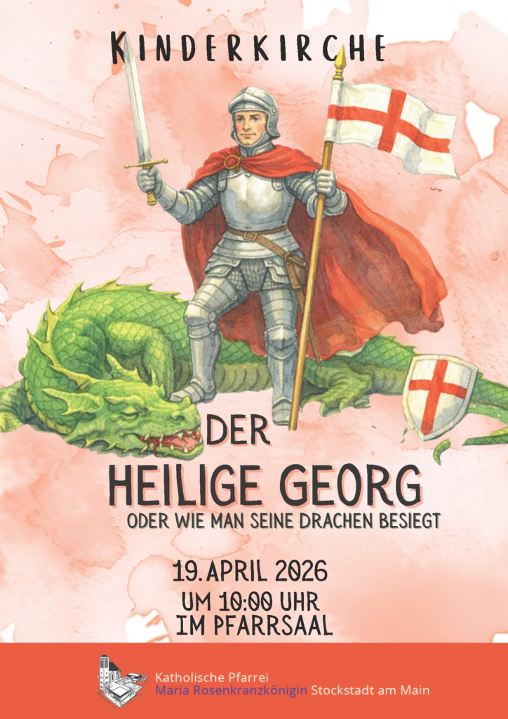 Am Sonntag, 19.04. findet um 10:00 Uhr im Pfarrzentrum die nächste Kinderkirche zum Thema: „Hl. Georg“ statt.
