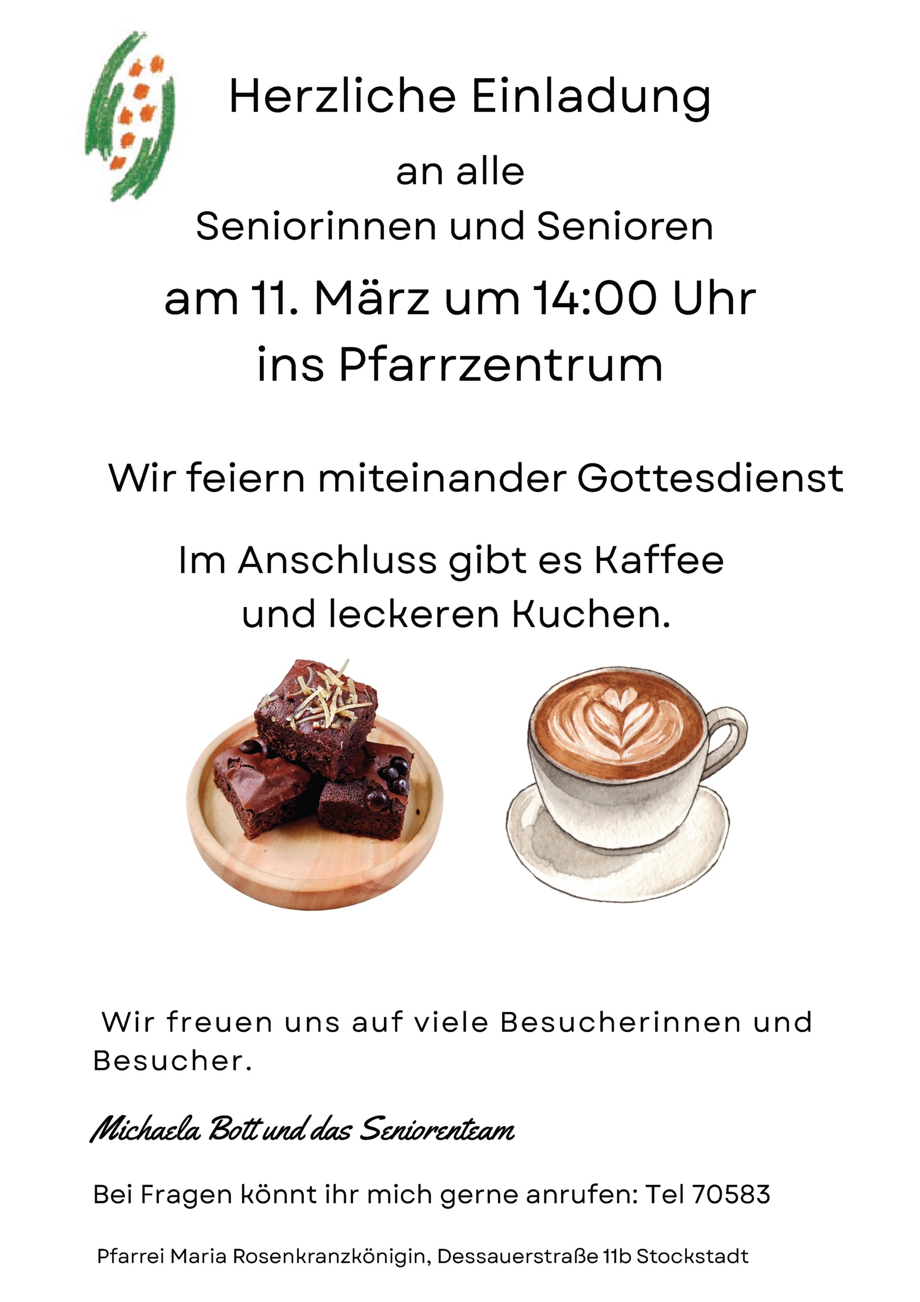 Liebe Seniorinnen und Senioren, wir wollen uns am 11.03.2026 um 14:00 Uhr im Pfarrzentrum treffen, um Gottesdienst zu feiern.