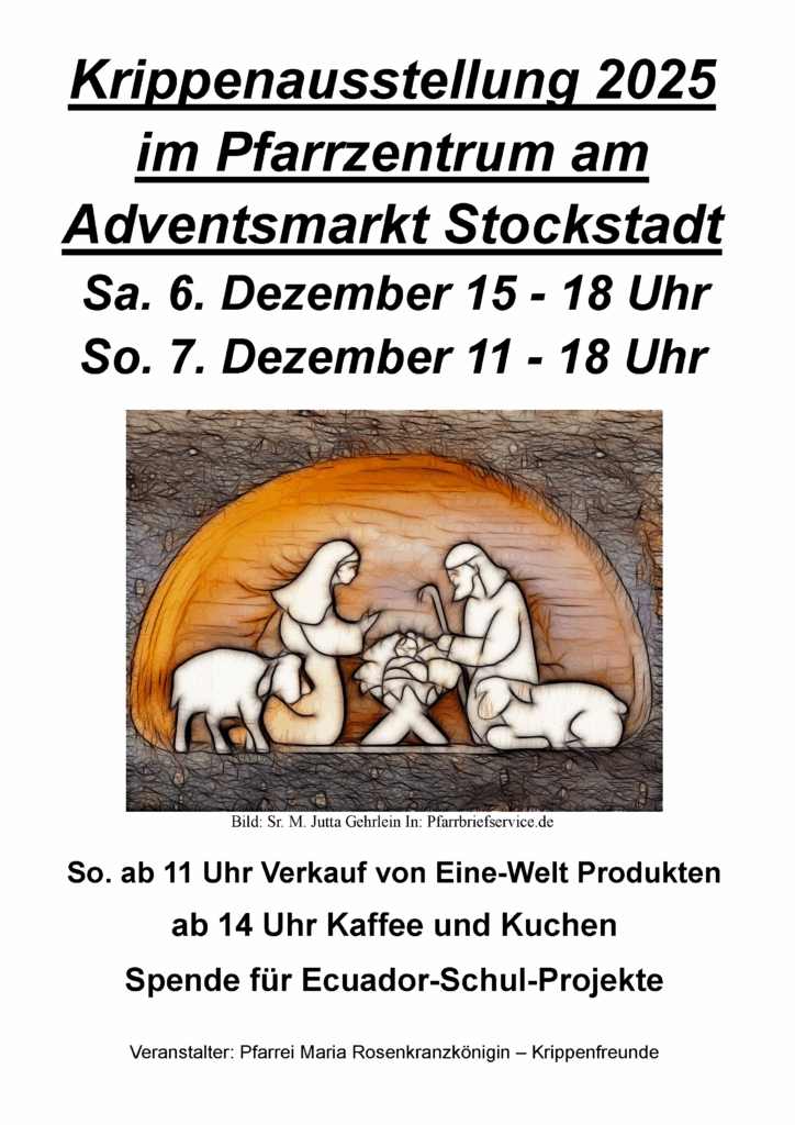 Am Sa. 06.12. und So. 07.12. findet im Rahmen des Adventsmarkts eine Krippenausstellung der Krippenfreunde im Pfarrzentrum statt.