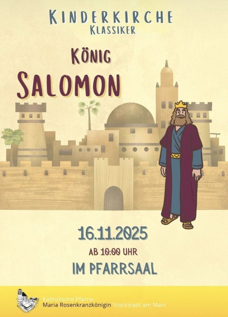 Am Sonntag, 16.11. findet um 10:00 Uhr im Pfarrzentrum die nächste Kinderkirche zum Thema: „König Salomon“ statt.