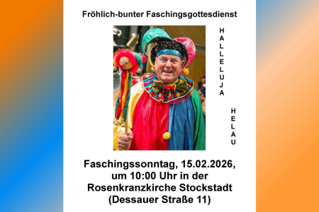 Herzliche Einladung zum fröhlich-bunten Faschingsgottesdienst am Faschingssonntag, dem 15. Februar 2026, um 10.00 Uhr in der Rosenkranzkirche in Stockstadt.