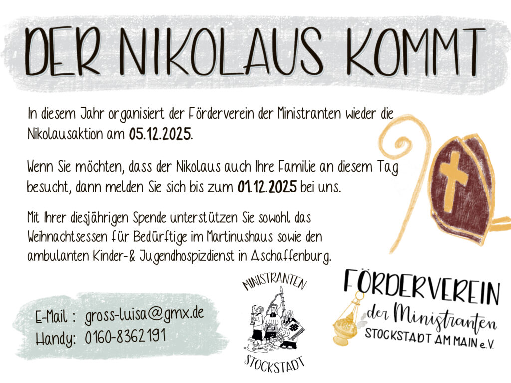 In diesem Jahr organisiert der Förderverein der Ministranten Stockstadt am Main e.V. wieder die Nikolausaktion am Freitag, den 05.12.2025.