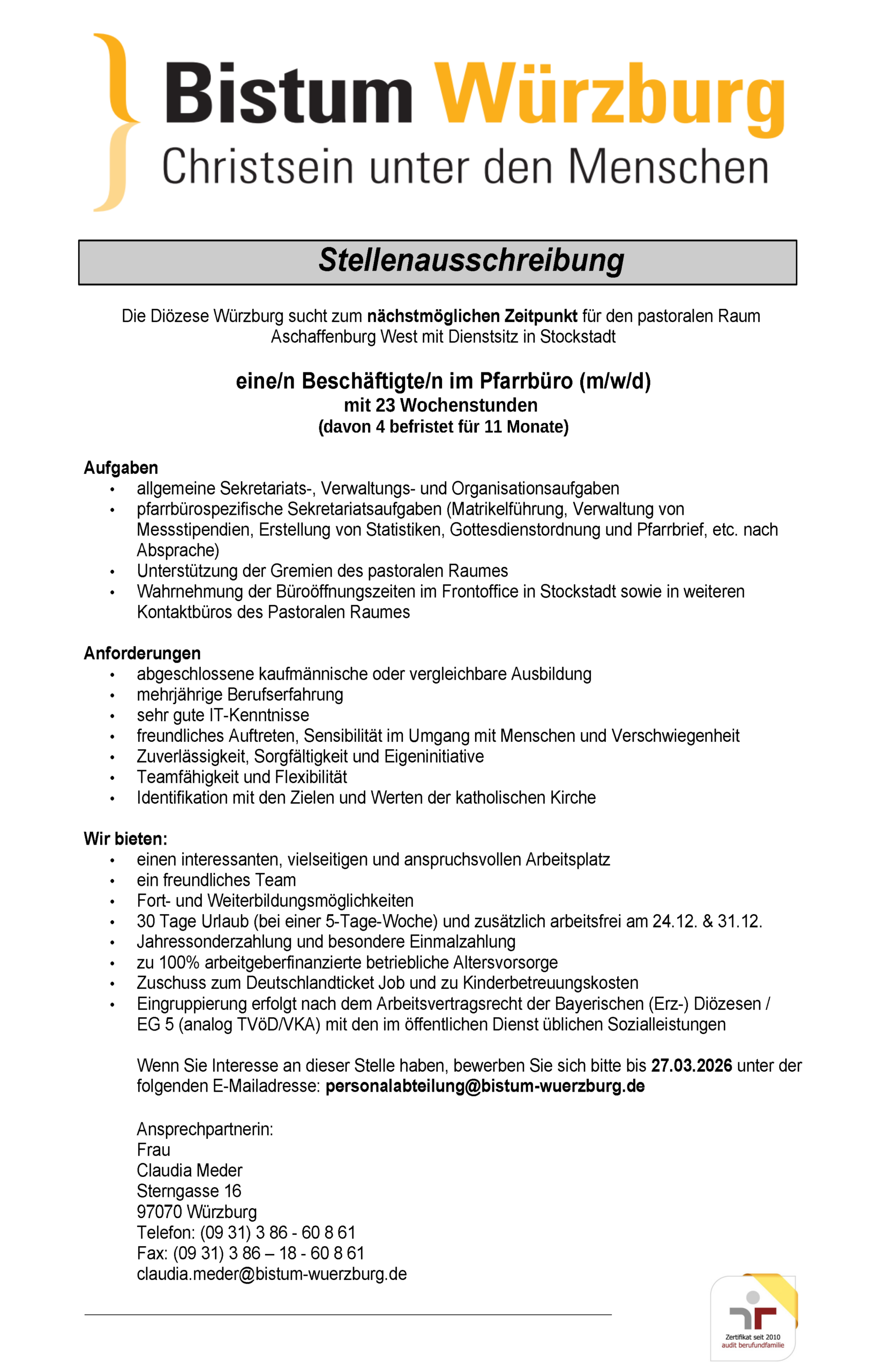 Verwaltungsleitung Aschaffenburg West – Stellenanzeige zum Download in PDF